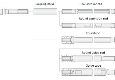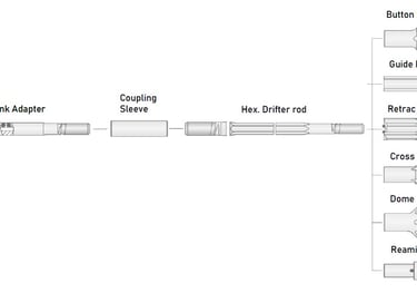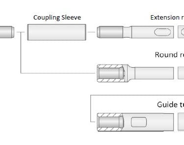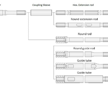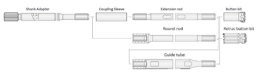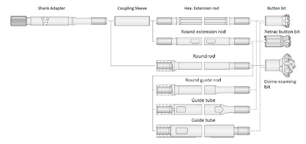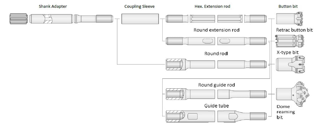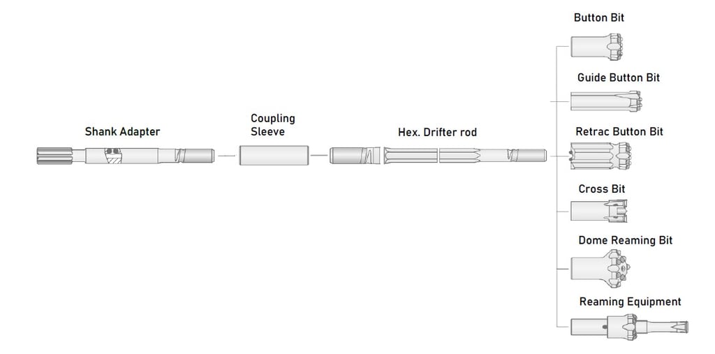Button Bit size range: 89mm to 127mm. Face design: Flat, Convex, Concave or Drop Center. TC buttons grade: Customizable as per requirement. Shank Adapter: All common makes, if required can manufacture if sample provided. Coupling Sleeves. Guide Rods, Drifter Rods & Extension Rods.
